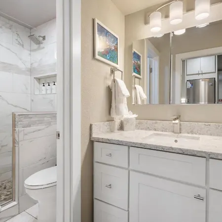 Walk To Ski, Stylish & Bright! Ground Floor, Hot Tub, Pool Condo features a bathroom with a hair dryer.